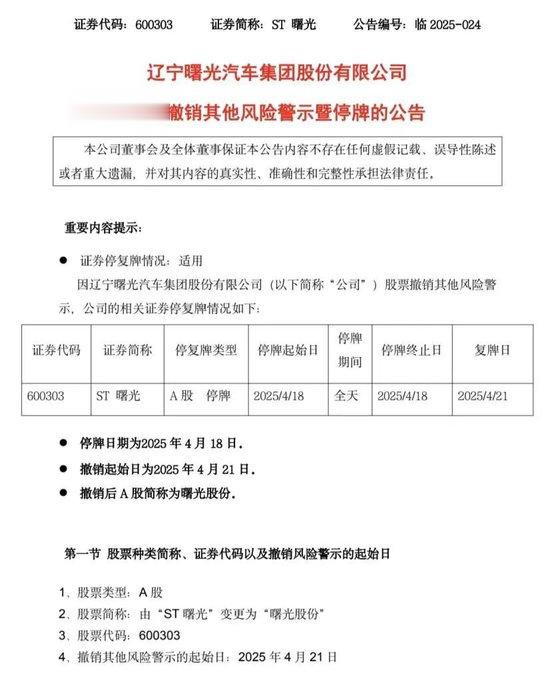 4月17日晚间,ST曙光(股票代码:600303)发布公告称,上海证券交易所于2025年4月17日同意公司撤销其他风险警示,公司股票将于4月18日起停牌一天,4月21日起复牌并撤销其他风险警示。撤销风险警示后,公司股票转出风险警示板交易,证券简称由“ST曙光”变更为“曙光股份”,股票代码仍为600303。公司股票价格的日涨跌幅限制由5%变更为10%。